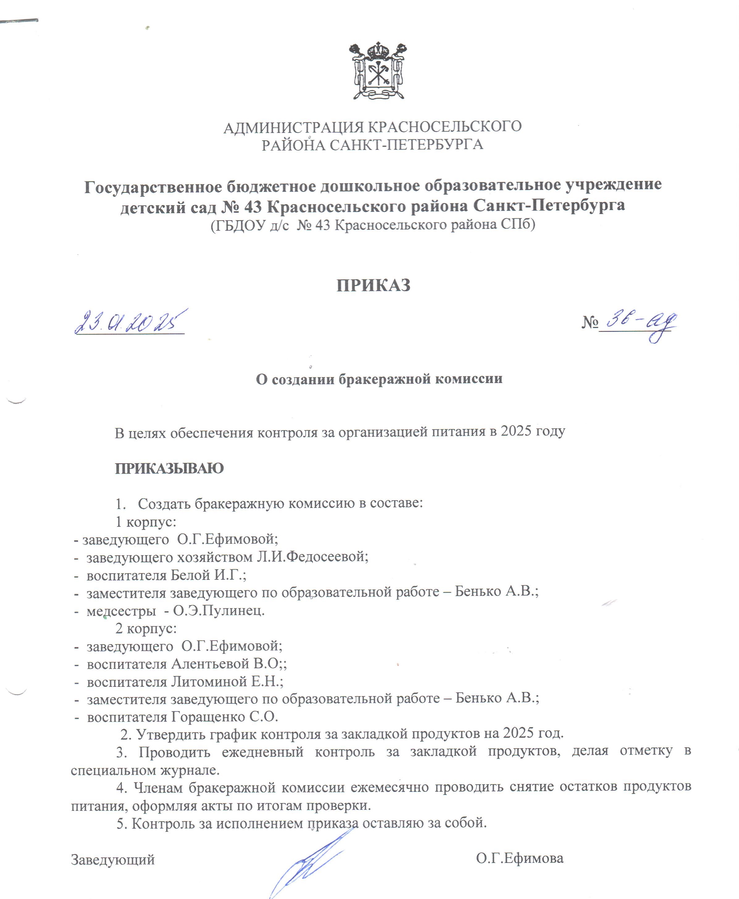 По любым вопросам организации и качества питания детей вы можете обратиться к заведующему ГБДОУ д/с № 43 Ефимовой Ольге Геннадьевне: