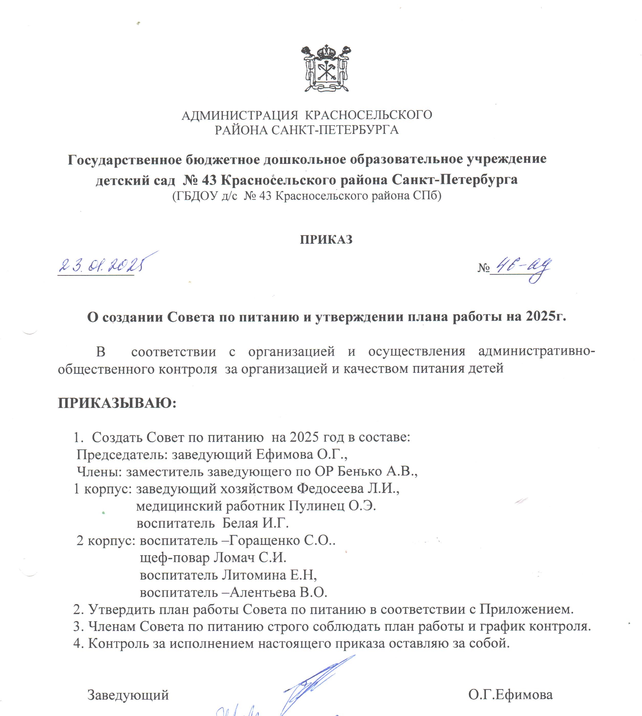 Приказ об утверждении состава Совета по питанию